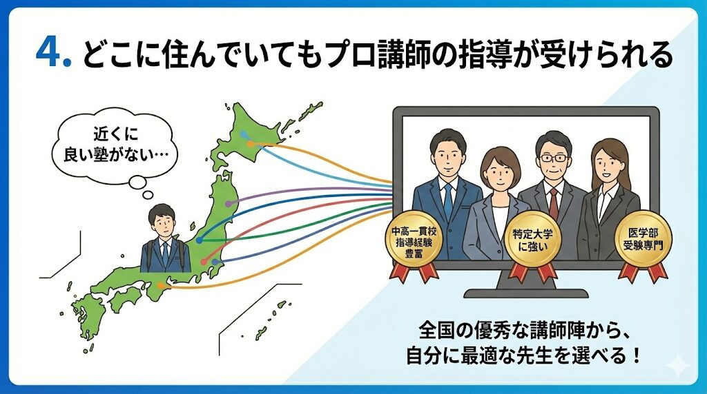 地方に住んでいる場合や、自宅の近くに希望する塾がない場合でも、オンライン塾なら全国の優秀な講師陣の中から、自分に最適な先生を選ぶことができます。